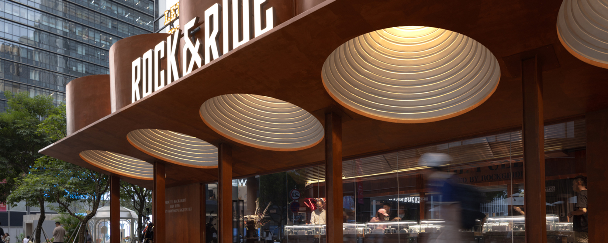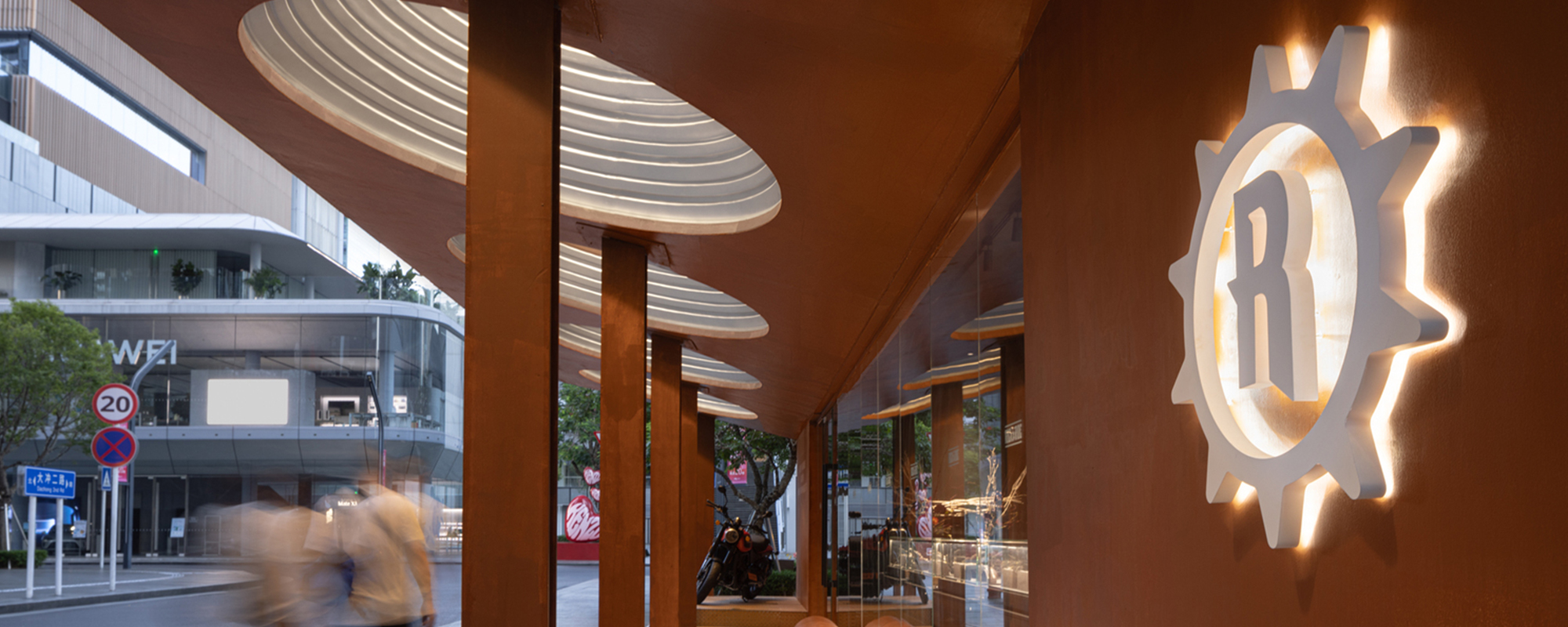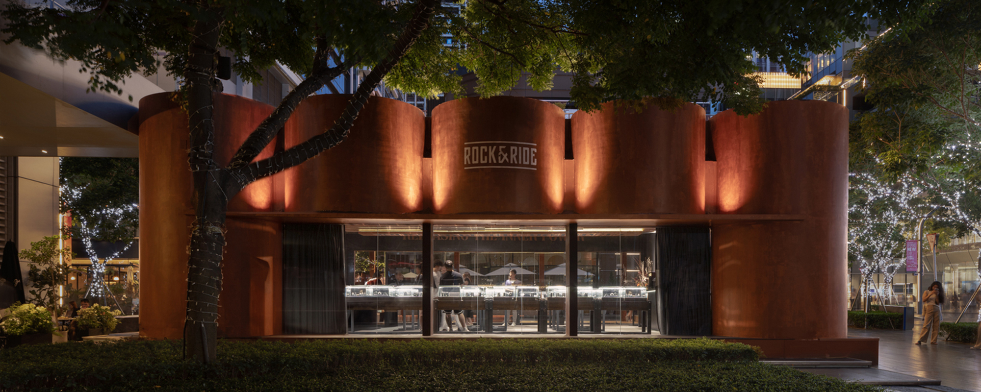 项目位于深圳万象天地,位于商业街入口,也是人群聚集的核心区,场地中心有预留的天篷。如何处理新建筑与城市的关系,如何平衡快闪店的“轻”与品牌的“重”,如何解决天篷对建筑形式的影响,是该项目的突破点。